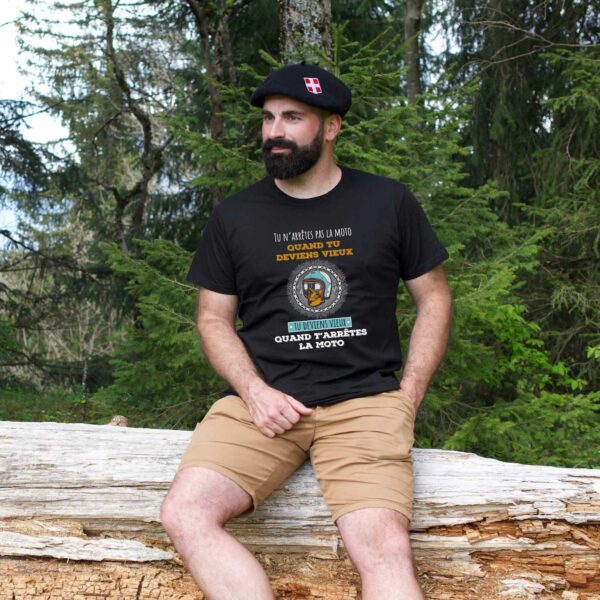 Tee shirt « tu n’arrêtes pas la moto quand tu deviens vieux, tu deviens vieux quand t’arrêtes la moto » est fait pour vous !